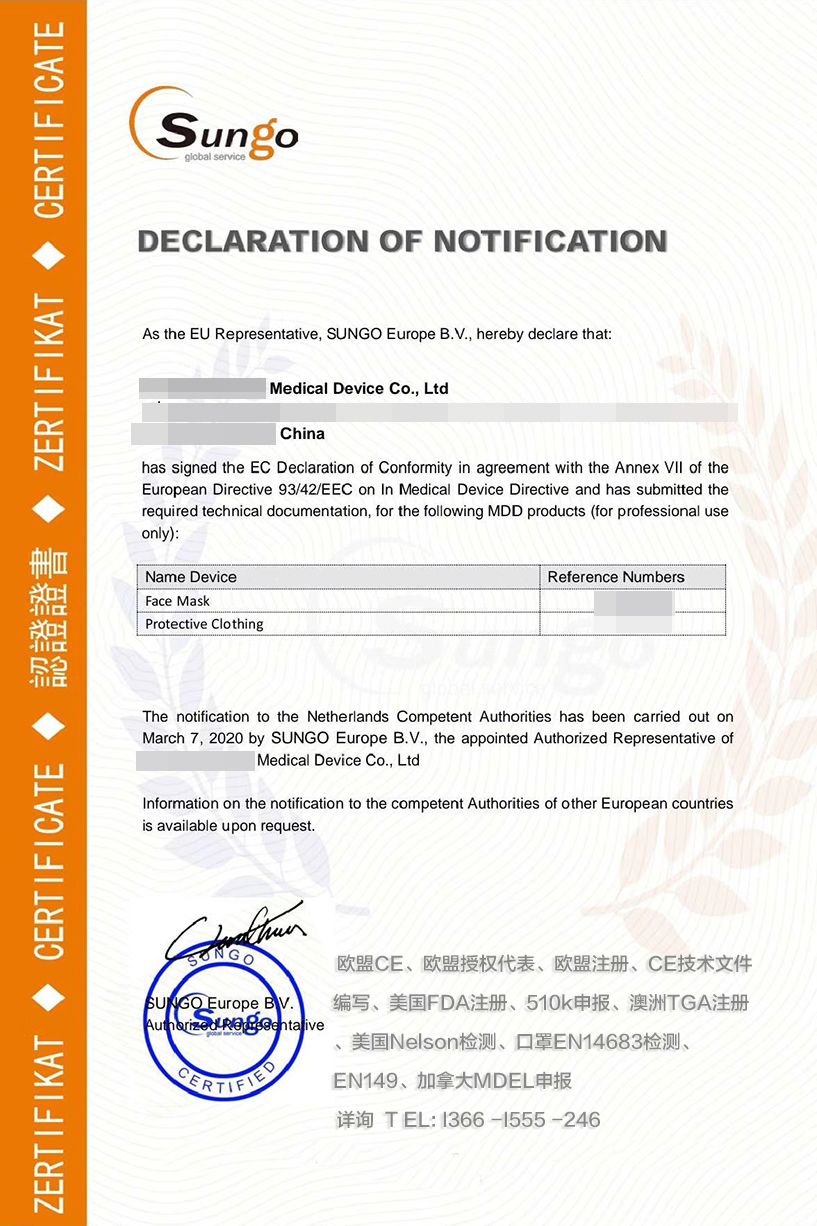 非无菌:口罩和防护服如是非无菌的产品,在欧盟是I类产品,走自我符合性声明的路径,无需公告机构审核,办理流程如下: